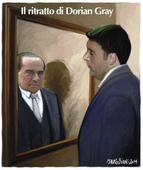La France dopo la Bastiglia si sa, è sempre stata in vetta sopratutto nella fuffa. Ma nelle vignette siamo ancora primi noi. Ieri su facebook appariva un post intitolato “il ritratto di Dorian Gray“, ispirato alfamosissimo romanzo di Oscar Wilde. Col patacca Matteo Renzie che si guarda tronfio allo specchio vedendo riflessa l’immagine invadente di Silvio Berlusconi, il nemico feroce che doveva rottamare.