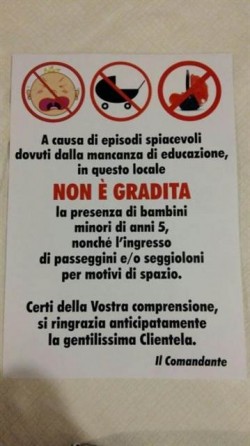 “A causa di episodi spiacevoli dovuti alla mancanza di educazione, in questo locale non è gradita la presenza di bambini minori di anni 5, nonché l’ingresso di passeggini e/o seggioloni per motivi di spazio. Certi della vostra comprensione, si ringrazia anticipatamente la gentilissima clientela”.